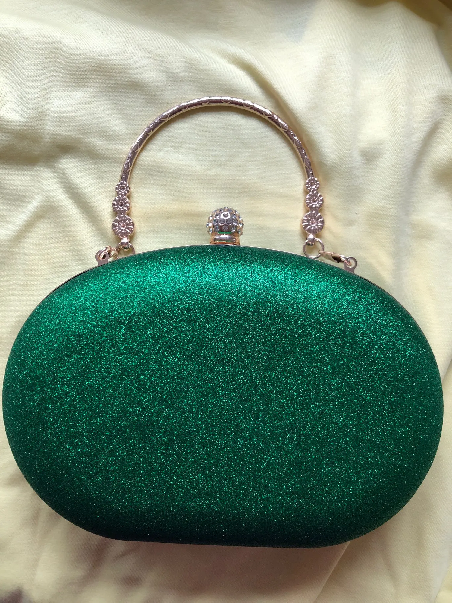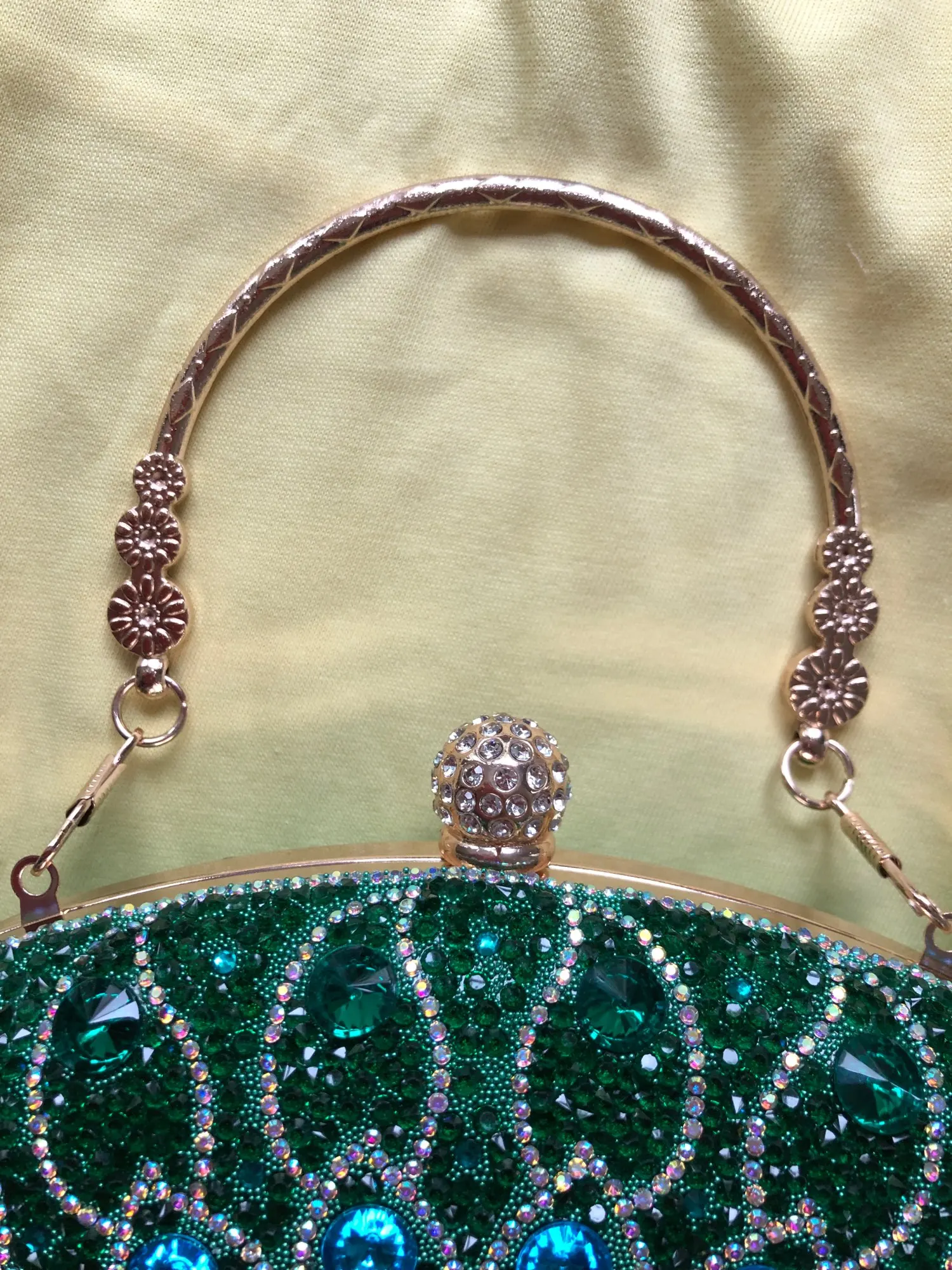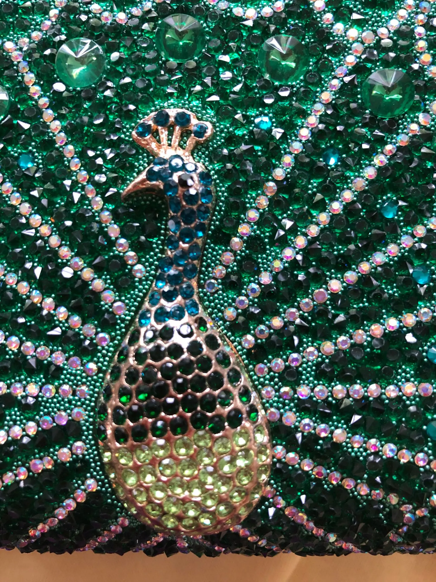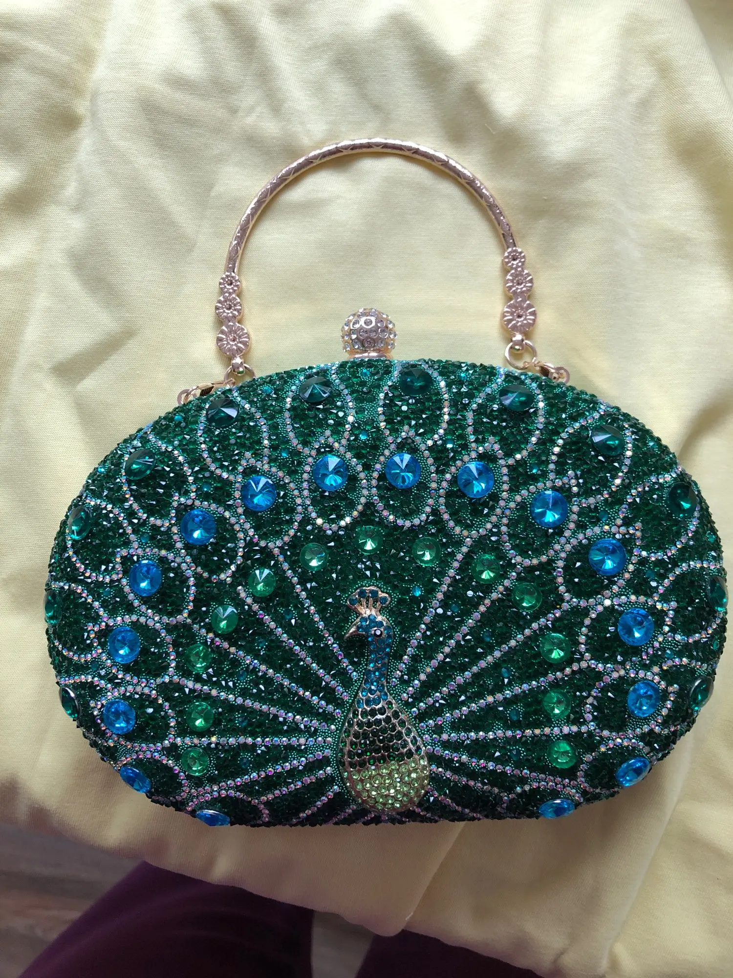 •    Unique Peacock Design: The vibrant green and blue rhinestones form an elegant peacock motif with a gold-tone frame—making this clutch a true statement piece.